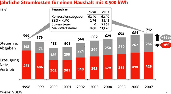 Die Erhöhung beruht nicht nur auf der Einführung des regenerativen Stroms, deren Anteil am Preis hat sich aber in nichtmal 10 Jahren um das 15-fache erhöht und das war mein Punkt. Wenn es ähnlich weiter geht, werden bald die anderen Anteile, die für Preiserhöhungen verantwortlich sind, vernachlässigbar klein.