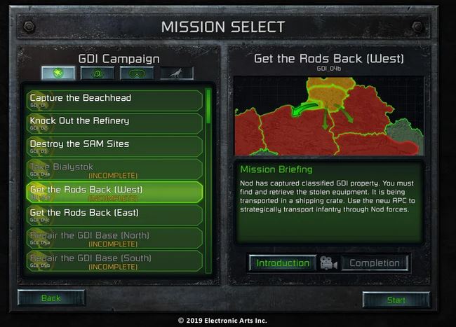 We’re nearing the completion of our second production milestone, and significant progress has been made over the past several weeks. The entire GDI Campaign is getting close to Alpha quality, including the ability to play through the campaign in succession with all the proper transitions. Items like the European Mission Map are currently getting remastered in 4k, which is giving the campaign a truly rich high definition experience. With the topic of campaign progression in mind, we wanted to share a preview of a new screen we’re introducing into the remasters - the Mission Selection screen.