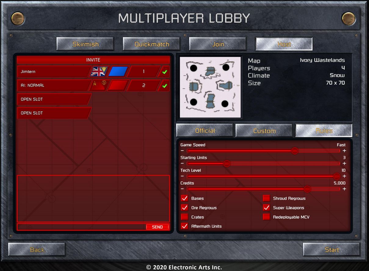 At a high level, Multiplayer has effectively been rebuilt for the Remaster. Starting with the backend, Multiplayer now runs on dedicated servers based on Petroglyph’s architecture, with a goal of providing reliable connections and prevent misbehavior. We’ve been playing multiplayer games for several months with our QA teams around the world, and feeling confident about the stability the architecture is providing. Now let’s jump into the actual modes and features.