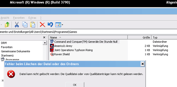 Immer wenn ich löschen will sagt er das er das nicht lesen kann und das es auf den Zielträger nicht zu finden sei! Das Game lag in d:\Games\C&C - es ist egal ob WinXP, Win2000 oder auch Win2003 - immer ist dieser doofe Ordner da, und immer kann man Ihn nicht löschen!! Wie bekomme ich den denn nun weg? Hat jemand ne Lösung??