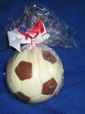 Wie auch immer. Um alle noch ein wenig mehr zu motivieren, habe ich hin und her überlegt, was man dem Sieger denn wohl Passendes vermachen könnte. An diesem Wochenende habe ich dann endlich das Richtige gefunden. Einen Fußball, den man einfach zum Fressen gern haben muss. Er hat ungefähr einen Durchmesser von 15 cm und ist aus feiner Lindt-Schokolade. Also Leute strengt euch an... oder besser noch... strengt euch nicht an, dann gehört der Fußball nämlich mir. ![]()