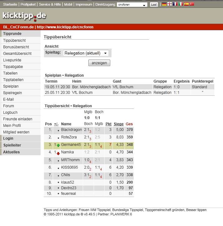Ruth hat es am letzten Spieltag ja doch noch ziemlich spannend gemacht *gg* Ruth, du solltest vielleicht das nächste Mal Oddset spielen, dann wärst du jetzt wahrscheinlich Millionärin, je nach Einsatz Aber wenigstens hab ich den Hermann noch überholt *gg*