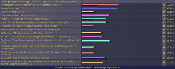 Beispiel: Bei dieser Umfrage haben 33 von 66 Usern für die Frage eins gestimmt. Richtig gerechnet es sind 50% der User die für diese Frage gestimmt haben. Ergo sollte der Balken bei dieser Frage, von der Mitte des Bilschirms bis ungefähr 3/4 des Bildschirms verlaufen tut es aber nicht sondern nur bis ungefähr 5/8, was dann ja ungefähr 25% wären. ich versuche mal das als Screenshot zu machen und einzuzeichnen.