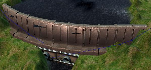 Ich würde übrigens am unteren Ende des Damms noch eine der Ufermauern aus dem Washington-Set einfügen, dann hätte der Damm auch gleich einen Wasserauslass.