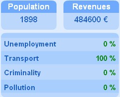 Population | Revenues 1884 | 480600 € Unemployment 0 % Transport 100 % Criminality 1 % Pollution 1 % |