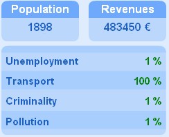 Population | Revenues 1884 | 480600 € Unemployment 0 % Transport 100 % Criminality 1 % Pollution 1 % |
