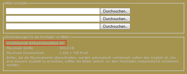 Benutzer und Clan Moderatoren können insgesamt 20 Bilder hochladen. Als Benutzer mit mehr als 5000 Posts dürf ihr bis zu 40 Bilder hochladen. Moderatoren haben ein Limit von 60 Bildern.