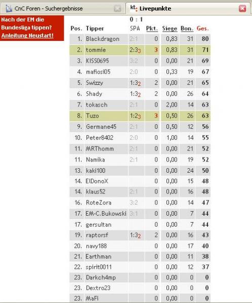 Es war wie immer spannend bis zum Schluss. Durch die vielen Bonuspunkte, ist das Tippen an die einzelnen Spiele teilweise unwichtig gewesen. Man sieht es daran, wenn man die letzten Bonuspunkte noch verteilt, wird Hermann seinen 2. Platz an Tommie verlieren, weil dieser wie ich noch 10 Bonuspunkte für den Europameister und Torschützenkönig bekommt.